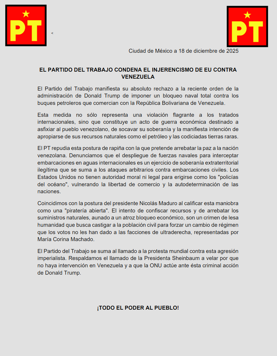 El Partido del Trabajo manifiesta su absoluto rechazo a la reciente orden de la administración de Donald Trump de imponer un bloqueo naval total