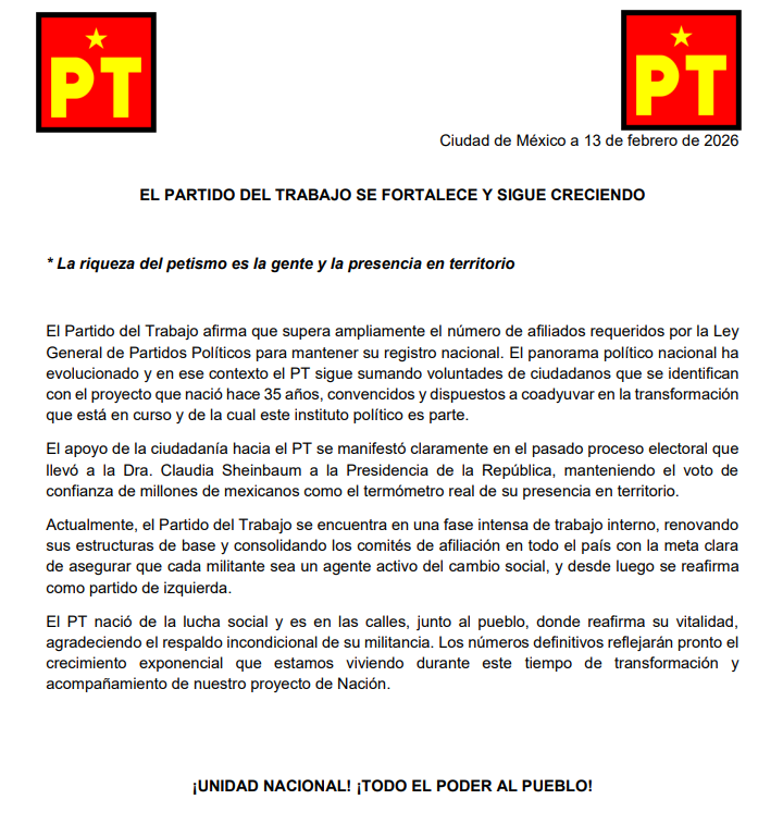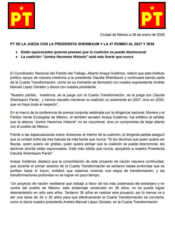 Ciudad de México a 16 de enero de 2026 PT RATIFICA SU COMPROMISO CON LA PRESIDENTA CLAUDIA SHEINBAUM Y LA CUARTA TRANSFORMACIÓN El Partido