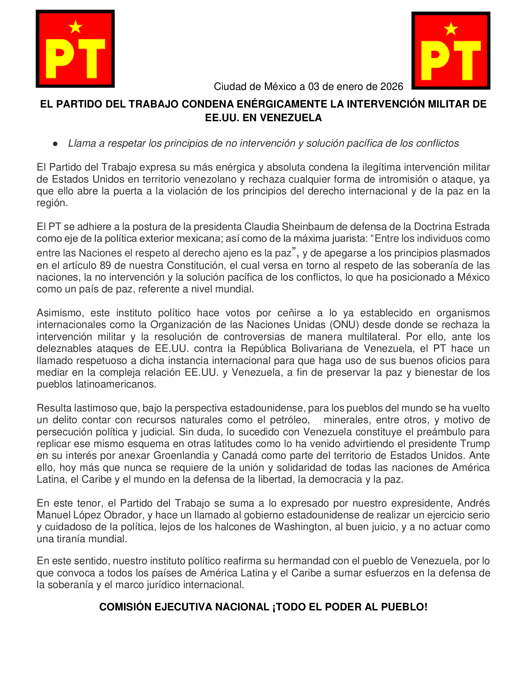 Ciudad de México a 03 de enero de 2026 EL PARTIDO DEL TRABAJO CONDENA ENÉRGICAMENTE LA INTERVENCIÓN MILITAR DE EE.UU. EN VENEZUELA Llama a