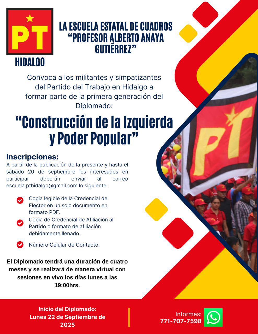 La Escuela de Cuadros PT Hidalgo “Profesor Alberto Anaya Gutiérrez” lanza una histórica convocatoria para militantes y simpatizantes del Partido del Trabajo en Hidalgo.